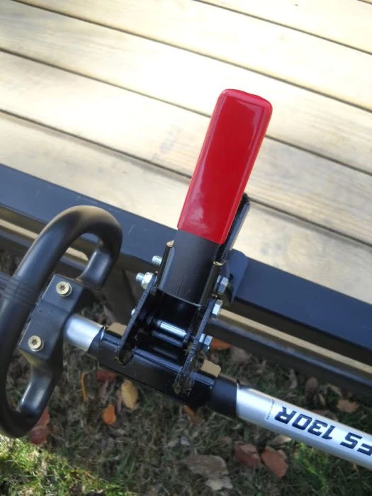Every landscape contractor needs at least one MR-1 Trimmer Clamp. Quickly load or unload trimmers with the flip of a single lever. The adjustable spring loaded jaws, equipped with large rubber pads, clamp down for a tight, firm grip on almost any line trimmer or stick edger. The most important feature of the MR-1 is its versatility. The clamp and clamp stand are designed as separate parts, and are available separately. This enables you to inexpensively equip numerous pieces of equipment with clamp stands yet purchase only as many clamps as needed. By simply removing a single pin, the clamp can be removed from its stand and installed into a different stand. Go from one mower to another or to a workbench in the shop. You can even install a clamp stand to your truck or trailer to be used when working on trimmers. How’s that for versatility?